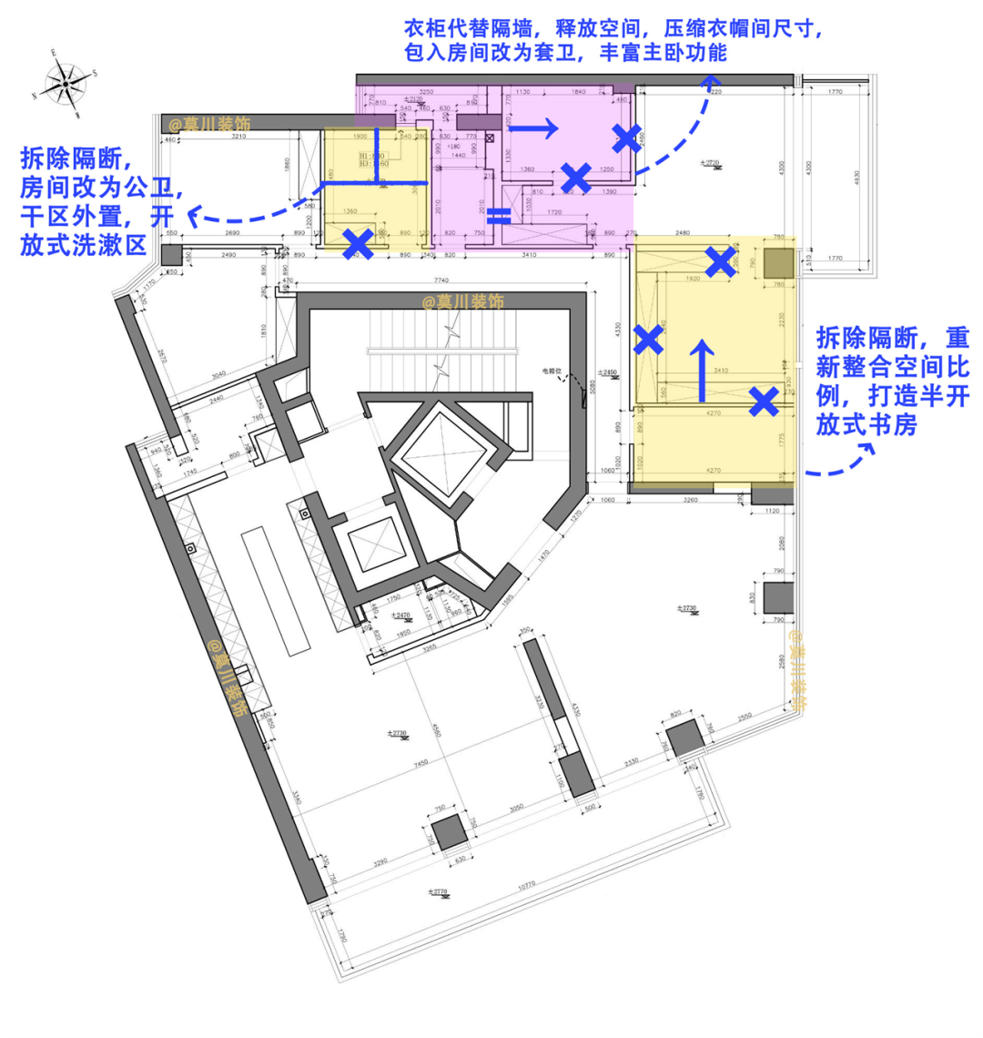 去掉采光不好的无用客房,用以改善公卫的空间尺寸和舒适度,将干区外置融合走廊空间,拓宽动线宽度,既改善走廊狭长问题又释放净手功能。内区淋浴与马桶左右分隔,隐蔽式水箱+挂墙马桶,不占空间还利用假墙解决收纳不足的小问题。