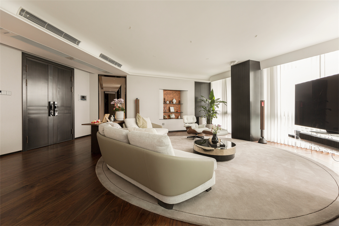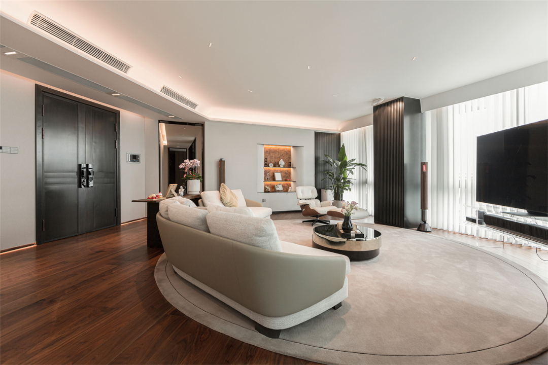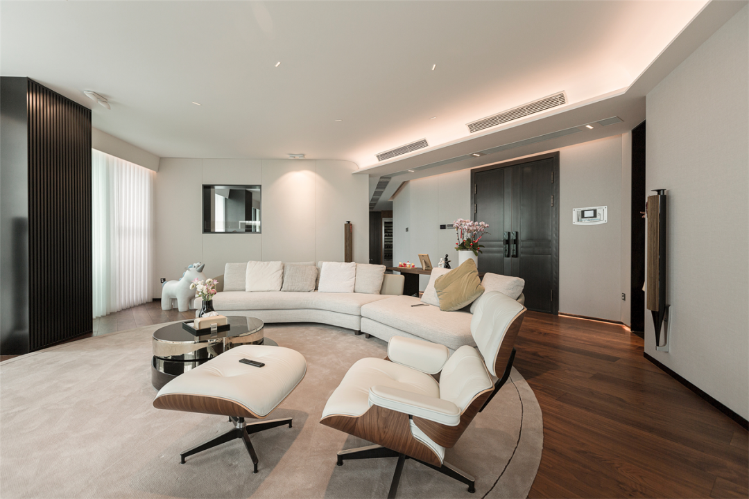 天花舍繁取简,弧形包梁处理边角,柔化会客厅不规则形态形成的生硬夹角,起到空间过渡作用。