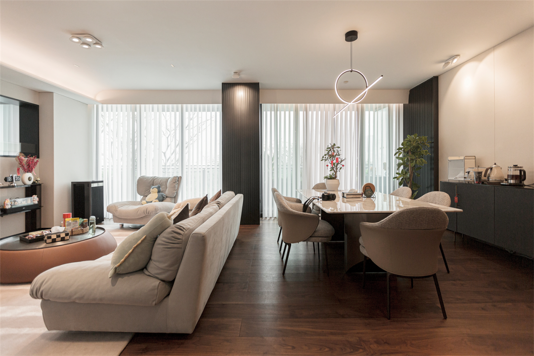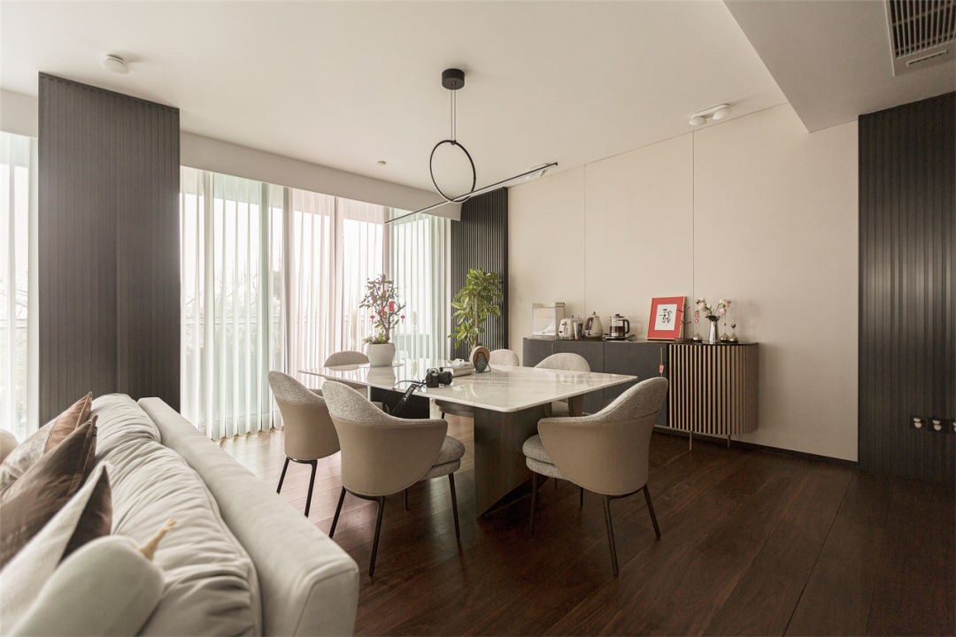 穿过会客厅走入第二空间,运用客厅+餐厅的大横厅设计,以沙发为界将客厅分为休闲活动区和用餐区,释放更多互动方式。