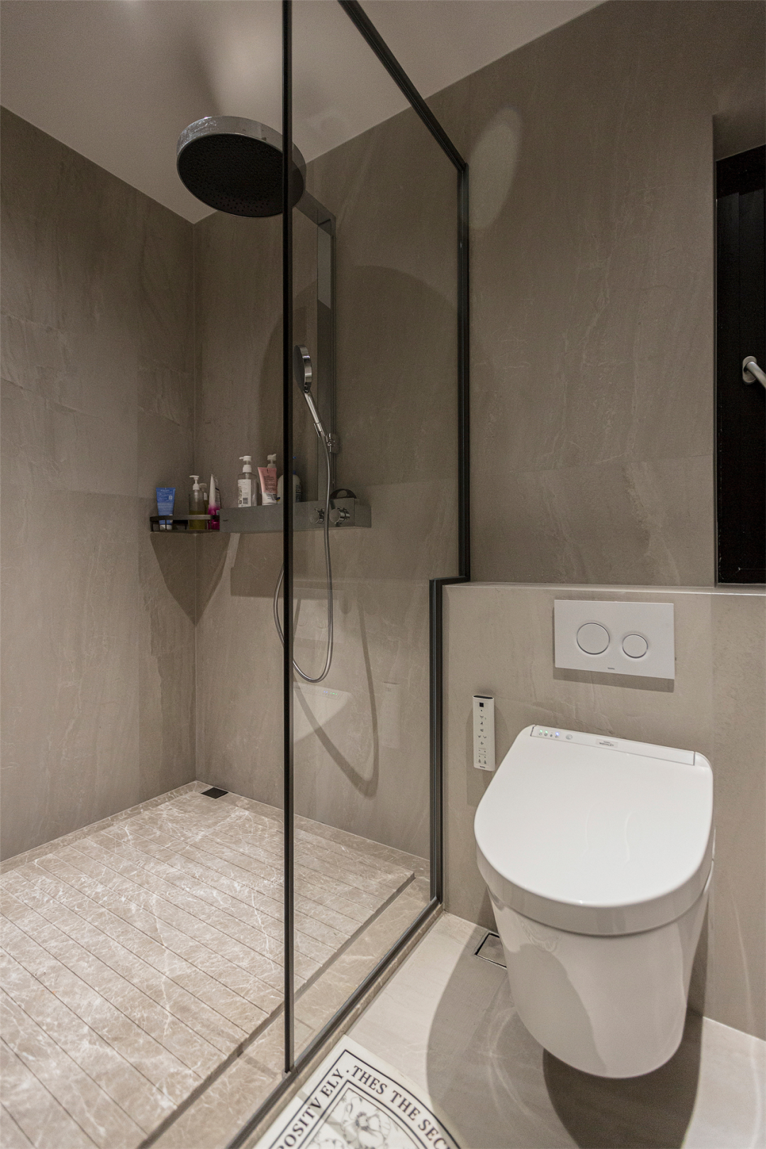 压缩衣帽间比例,拓宽自带生活阳台的房间,将其接入主卧成为淋浴、泡澡一条龙的套卫,丰富主卧功能;用欧文莱斐济砖与大理石交替搭建轻盈通透的卫生间,不同颜色与材质的砖面进行功能的分区,同时解决同层排水的问题。