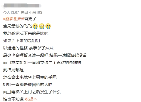 开放式结局不禁引人遐想,有网友猜测也许死的并不是妹妹梁曦,姐姐魏晓晨不忍心亲手杀掉妹妹,反而给了妹妹换衣服的时间。也有网友猜测死的就是妹妹,毕竟特警的反应力和准头都会比普通人要强。大家可以和娱记君一起期待下看看会不会有第二部!