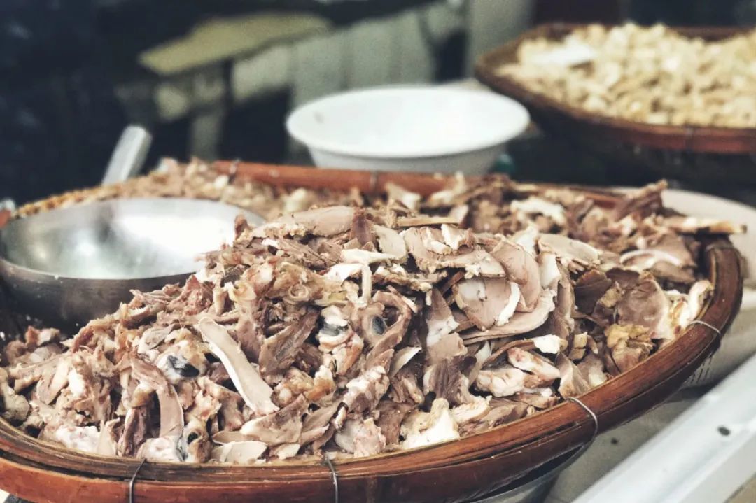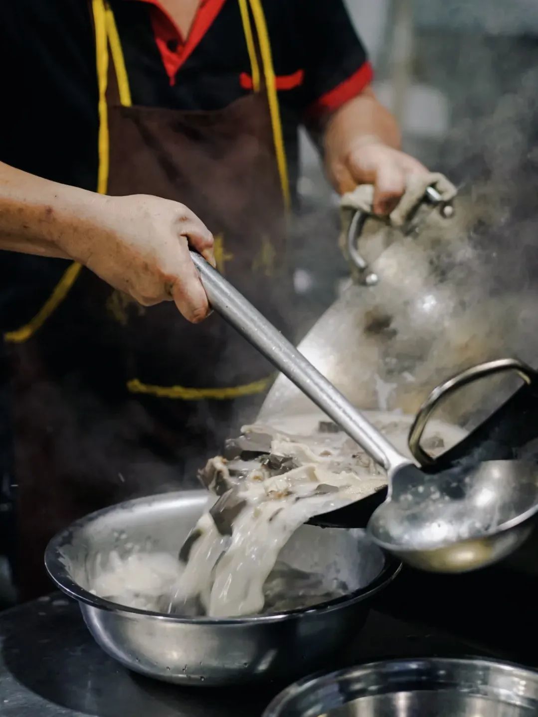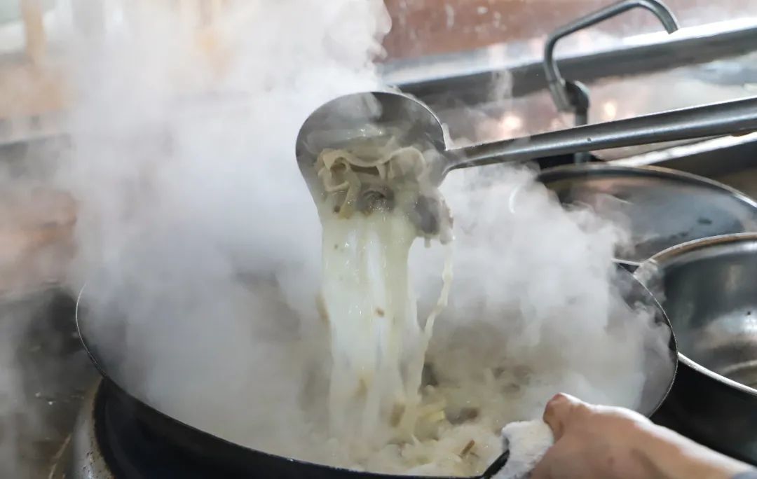 先煮肉,后炖汤。煮上两三个小时后捞出,炖汤的工序要在凌晨5点钟开门之后开始,用清水炖煮,会加些生姜压一压,所以午市是食客们用餐的最高峰。