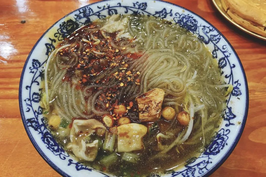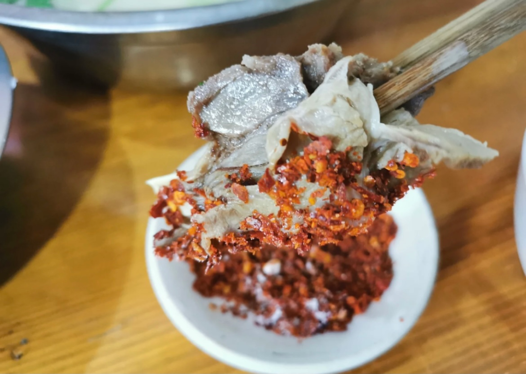 市区的馆子会端上香菜、豆腐乳的配料,搭配原汤一起吃。而这里的馆子,只配干海椒面,入口辣而不燥,再加一小撮盐巴就搞定。
