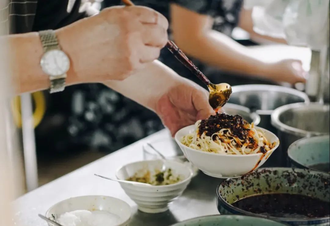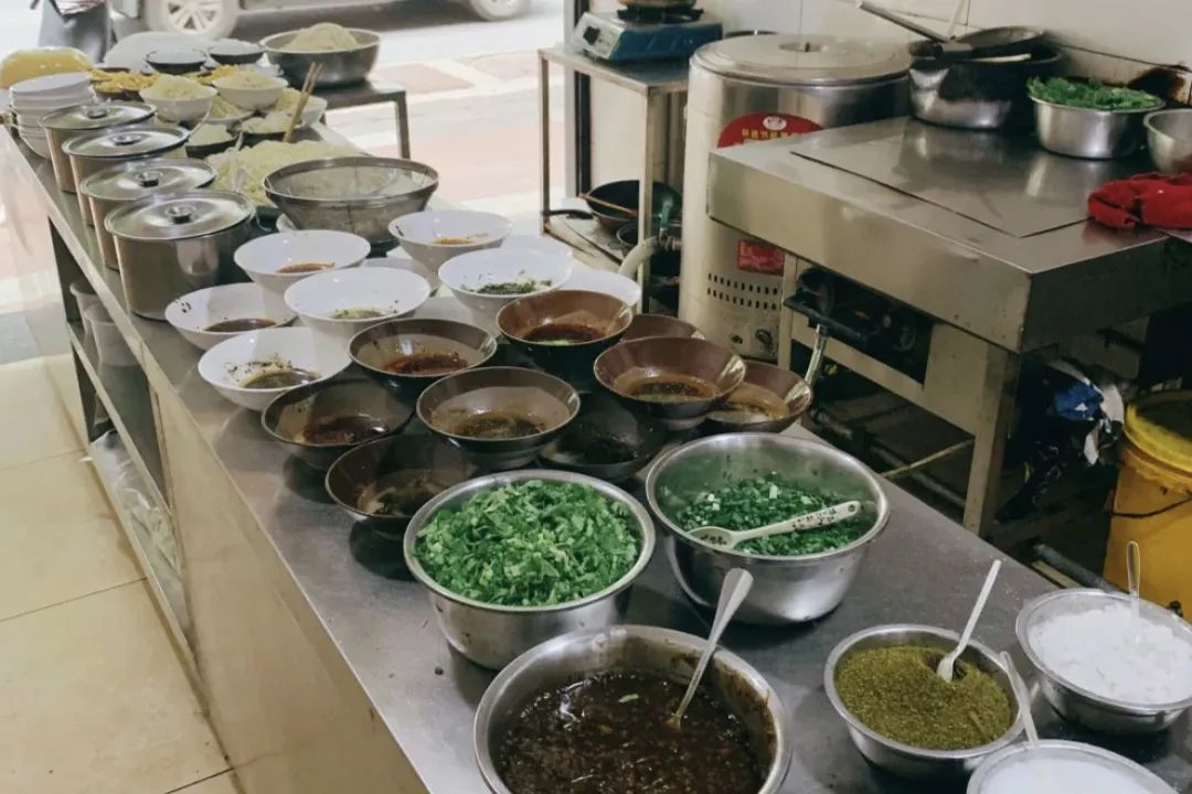 走进店里,码好的小料装在小碗里,灶台就在门口,都是现场打料,蒜蓉、葱花、红油......十几秒内飞速撒完。熟客们进来都是一白一黄,或者一份凉面。
