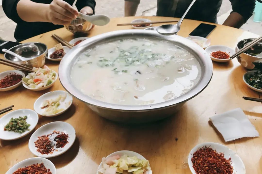 街巷的不少餐馆,会在深秋不约而同的支出大锅煮羊汤。以羊骨搭配沱江鲫鱼,鲜味十足,再以辣椒作为蘸水,搭配些许腐乳,三种颜色齐上桌。