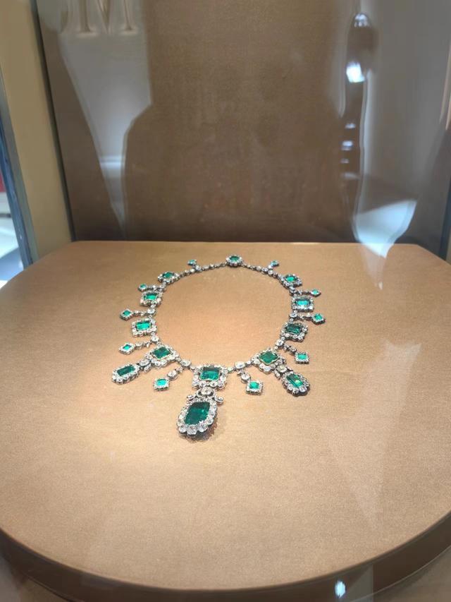 除了孔雀羽饰,此次V MUSE还展出了一件重量级的祖母绿钻石项链。1810年,这件传世珍宝诞生于法国皇帝拿破仑一世的御用珠宝大师Nitot之手,为拿破仑家族成员所拥有,其后几次易主。这件珠宝最闪耀的一次亮相是英国首相丘吉尔的夫⼈克莱门汀佩戴着它出席1953年诺贝尔奖颁奖典礼,并代表丘吉尔领受诺贝尔文学奖。