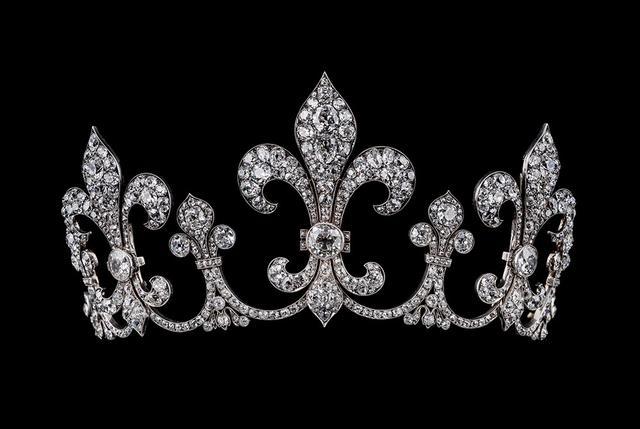 比如,百合冠冕来自波旁家族,曾属于波旁‐帕尔马王妃玛丽亚·安娜(Maria Anna)。这顶冠冕上的钻石曾被镶嵌于法兰西国王查理十世(Charles X)的圣灵骑士勋章,从勋章上取下后,传给了查理十世的曾孙、帕尔马公国统治者罗贝托一世(Robert I),后经家族委托,由维也纳珠宝商许布纳重新镶嵌在冠冕上。