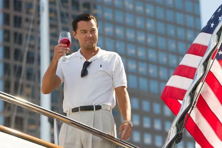莱昂纳多·迪卡普里奥在《华尔街之狼》的经典镜头中,穿着拉夫劳伦。