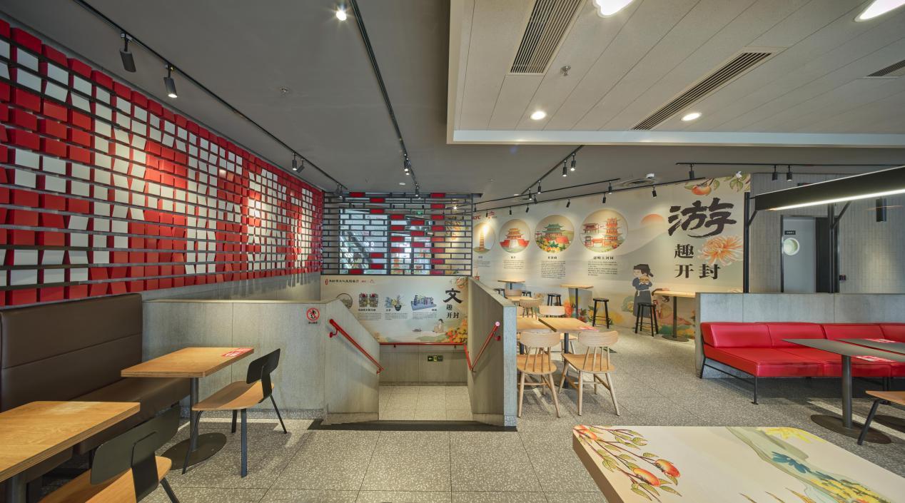 餐厅二楼临窗的吧台一直是顾客们青睐的就餐区域,在这里,品尝肯德基美食的同时还可以将鼓楼及鼓楼夜市美景尽收眼底。通宵达旦、热闹异常的夜市是开封这座古城的一大特色之一,据《东京梦华录》记载:“夜市直至三更尽,才五更又复开张,耍闹去处,通宵不绝。”一边品美食,一边赏美景,仿佛一眼梦回宋朝,感受“我在宋朝吃炸鸡”的别样体验。