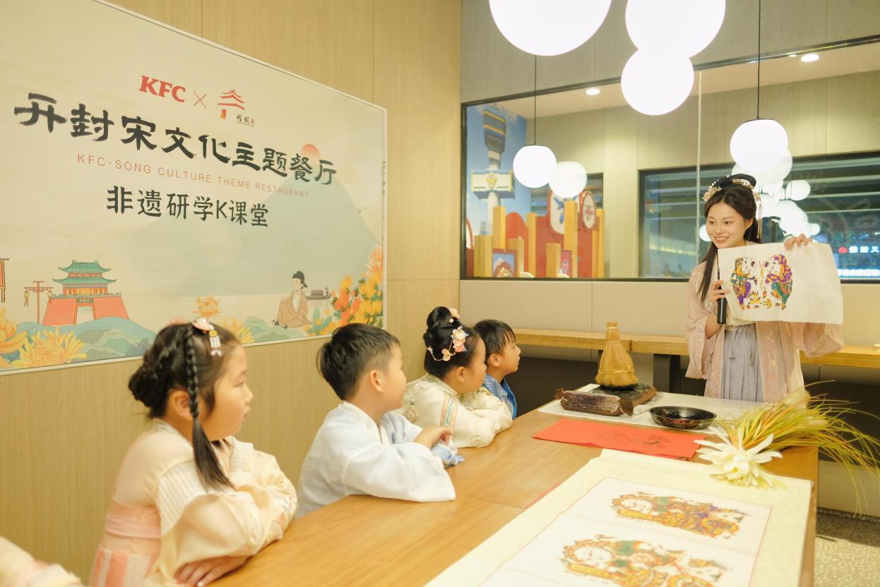 在主题餐厅揭幕当天,由河南肯德基联手开封文旅共同打造的“非遗研学K课堂”正式开课,现场邀请了开封博物馆朱仙镇木版年画保护中心工作人员来到餐厅授课7组会员家庭跟随老师一起,了解朱仙镇木版年画的起源、发展、特色、制作工艺及传承创新等方面的知识,体验如何印制木版年画,大家在实践中对朱仙镇木版年画有了更加直观、深入的认识。