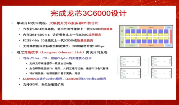 而龙芯中科此次还首次对外公布了“龙链技术”。龙链技术对标NVLink、CXL,可实现Chiplet(小芯片、芯粒)的连接。龙芯中科表示,龙链技术相较于3A5000的片间互联协议比片间互联延迟成倍降低,带宽提高了好几倍,大大提高多片协同工作的性能。而龙链跟N VLink比,速率还低一些(目前每位速率是16Gbps,下一步将提高到32Gbps),但效率已经不错了。龙芯中科董事长、总经理胡伟武表示:“3C6000比3C5000通用处理性能、IO性能、片间互联性能均大幅提高,成本有所降低,我自己觉得应该在特定的开放市场有一定竞争力了。”