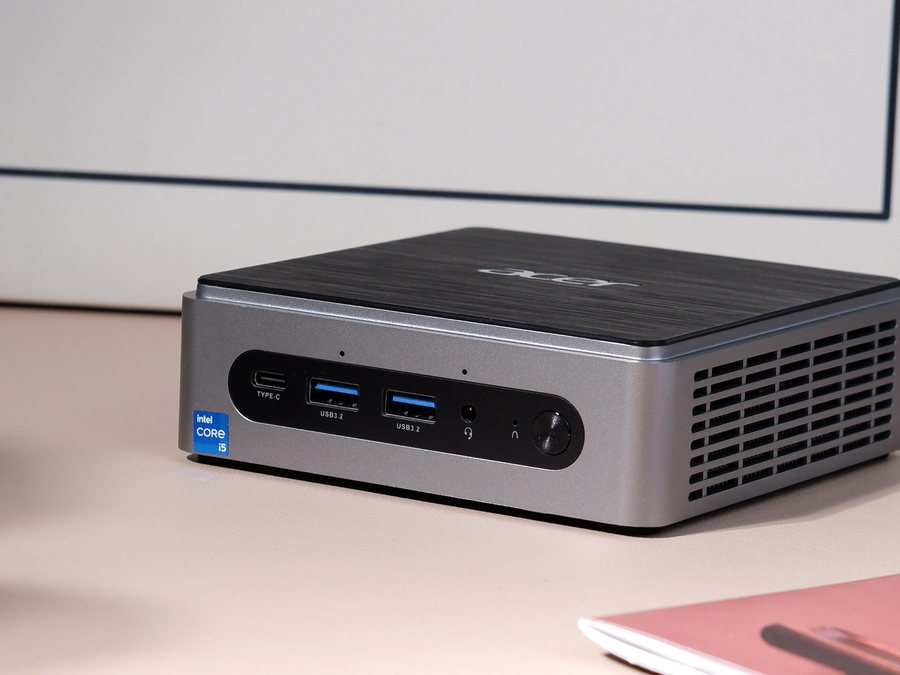 宏碁蜂鸟M迷你台式主机的机器正面,从左到右依次设计了一个Type-C接口、两个USB 3.2接口、一个耳机/耳麦二合一接口、以及开机键。此外,机器正面还贴有12代酷睿i5的品牌贴纸。