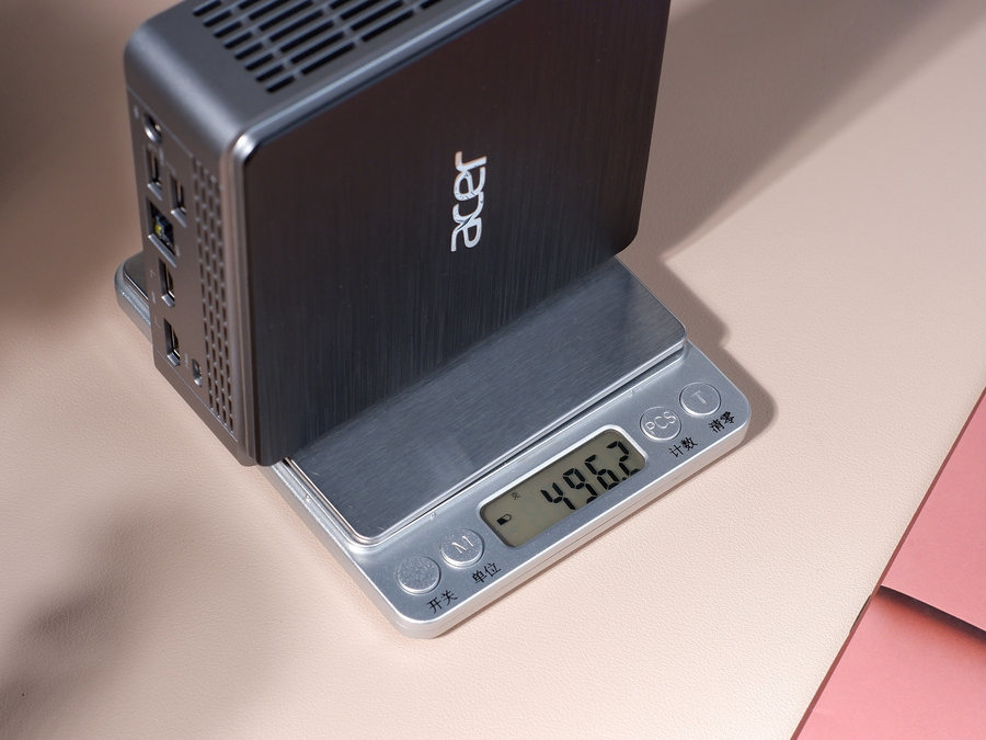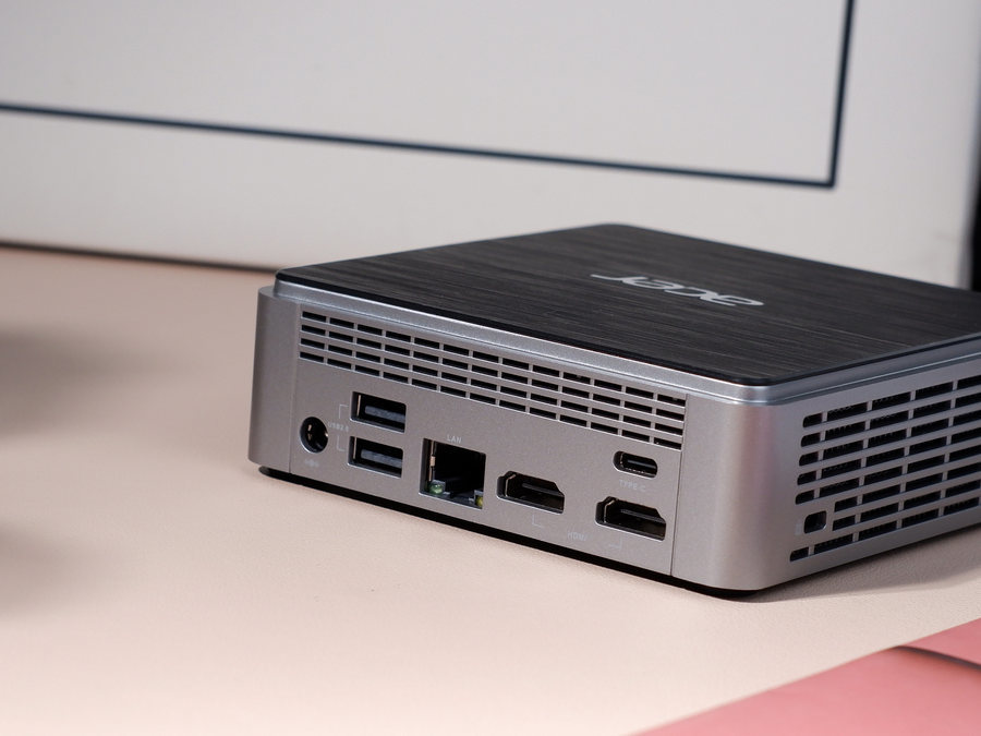 从外观来看,宏碁蜂鸟M迷你台式主机与很多迷你台式主机一样,整机类似一个小盒子。机身外观主要采用黑、灰配色设计,摆放在桌面上很小巧,也很低调。