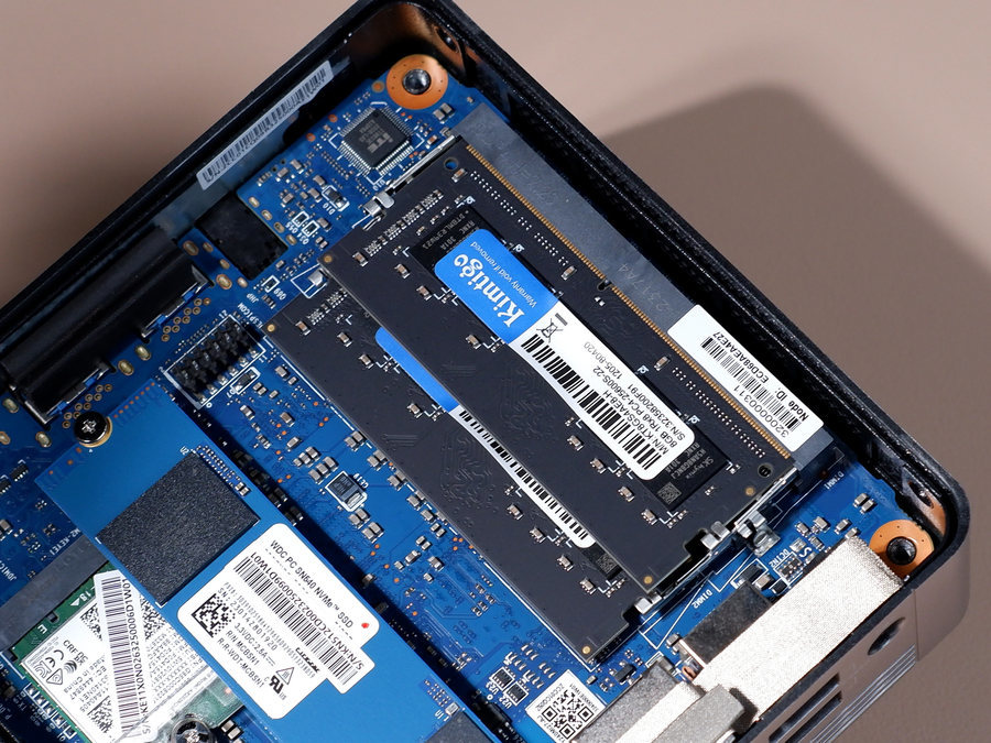 这款迷你台式主机配备了两条DDR4笔记本内存插槽。笔者手中这台评测机预装有金泰克2×8GB DDR4-3200笔记本内存。