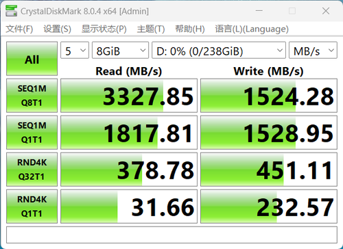 通过CrystalDiskMark这款测试软件的成绩来看,这款固态硬盘有着超过3300MB/s的顺序读取速度,超过1500MB/s的顺序写入速度,性能较好。