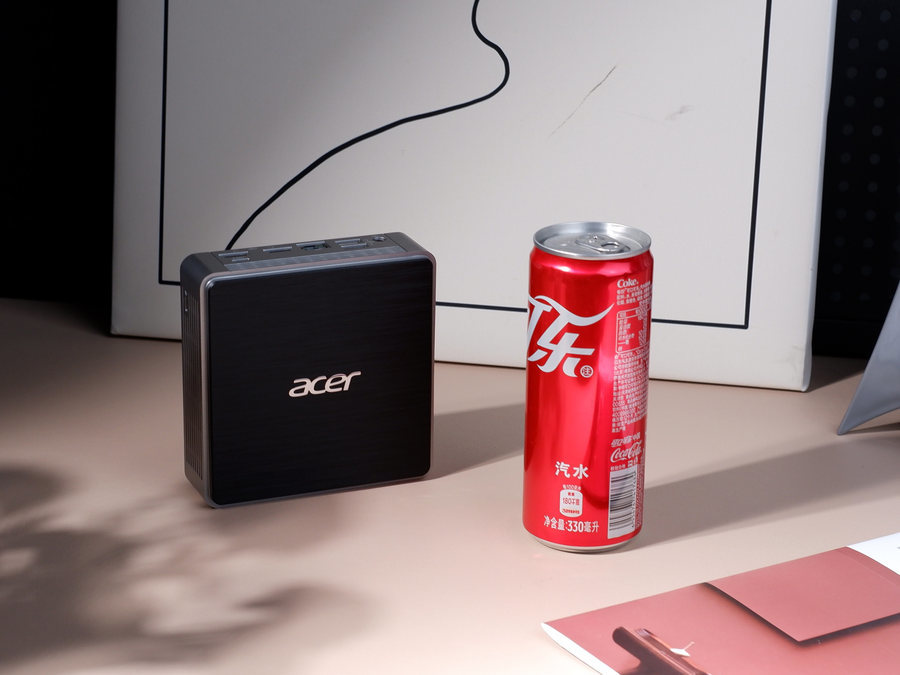 将宏碁蜂鸟M迷你台式主机与一听330ml的可口可乐放在一起进行对比,能够直观的感受到这款迷你台式主机小巧的机身设计。