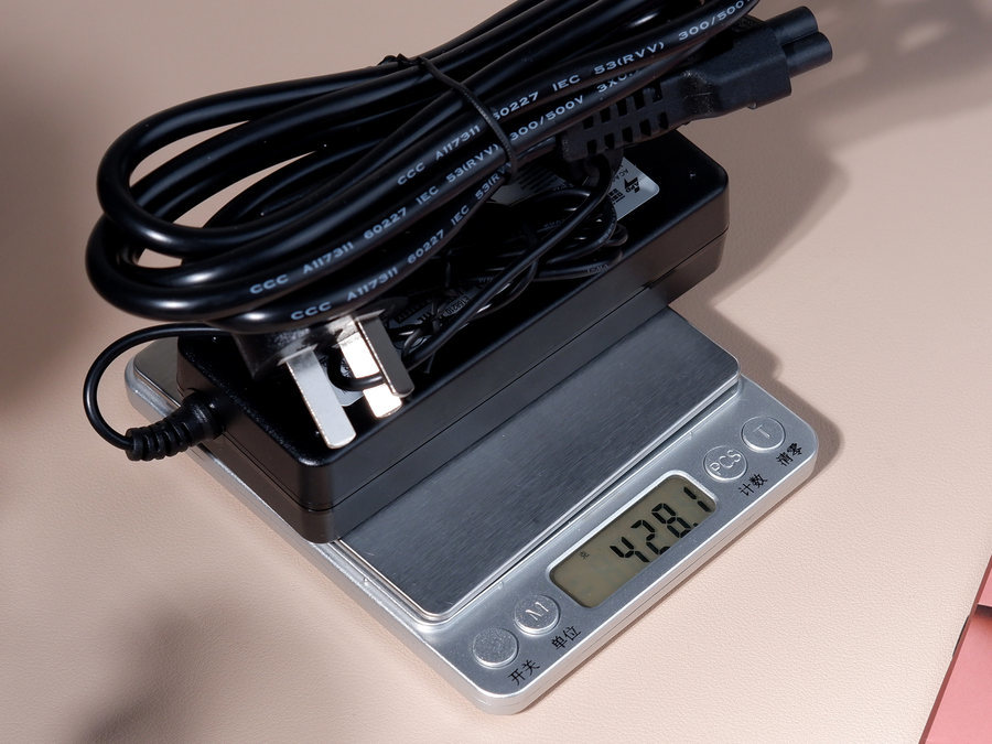经过实测,笔者这台评测机器的机重量约为496g,90W电源适配器重量约为428g,全部加在一切不到1kg,便携式较好。(注意,存储配置不同,机身重量会存在较小的差异。)