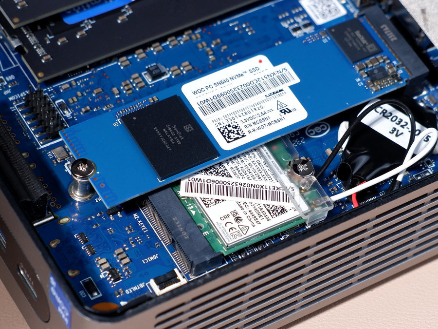 这款迷你台式主机配备了一处M.2 2280固态硬盘安装位。笔者手中这台评测机预装有一块西部数据SN540系列固态硬盘,容量为512GB。