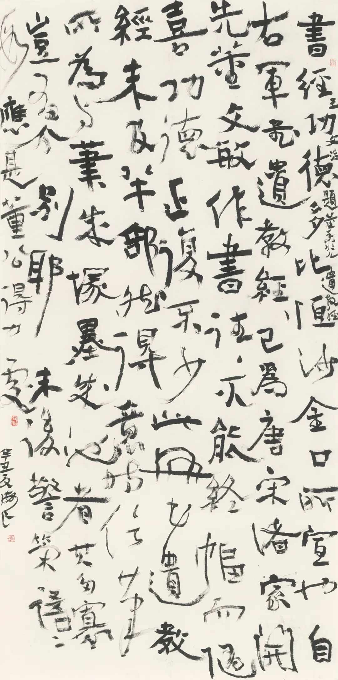 由于草书强调“意多于法”,这显然也会导致对“意”的过度解读和利用,从而使得草书也会失之于法,需对书法之“法”进行再度深入。如今已是执书坛牛耳的孙晓云主席,在1999年底曾也建议:“草书尤重基本功,特别是‘二王’,像《圣教序》之类,要重新摸索。”王羲之是今草成熟过程中的一座丰碑,王献之逸态百出,其“一笔书”更为大草的出现架设了空间。我辈学王,是书家之责任。从《圣教序》到《太清楼大观帖》,再到《万岁通天贴》。察“使转”之圭臬,辨“八法”之承用。明徐渭有“八法散圣”之称谓,我则强调“八法之尚工”。其实,草书是五体中最重法度的书体,无论笔法还是字法,差之毫厘,失之千里,正如孙过庭所谓“草乖使转,不能成字。”草书当是法之极致者追加自由与遐想方能成事。由此,我用了十多年的时间来溯源“二王”,从关注形质意味,到联想并发,至少使得书写用笔不至于过于草率,困守多年,明了草书虽“草”,不能草草。
