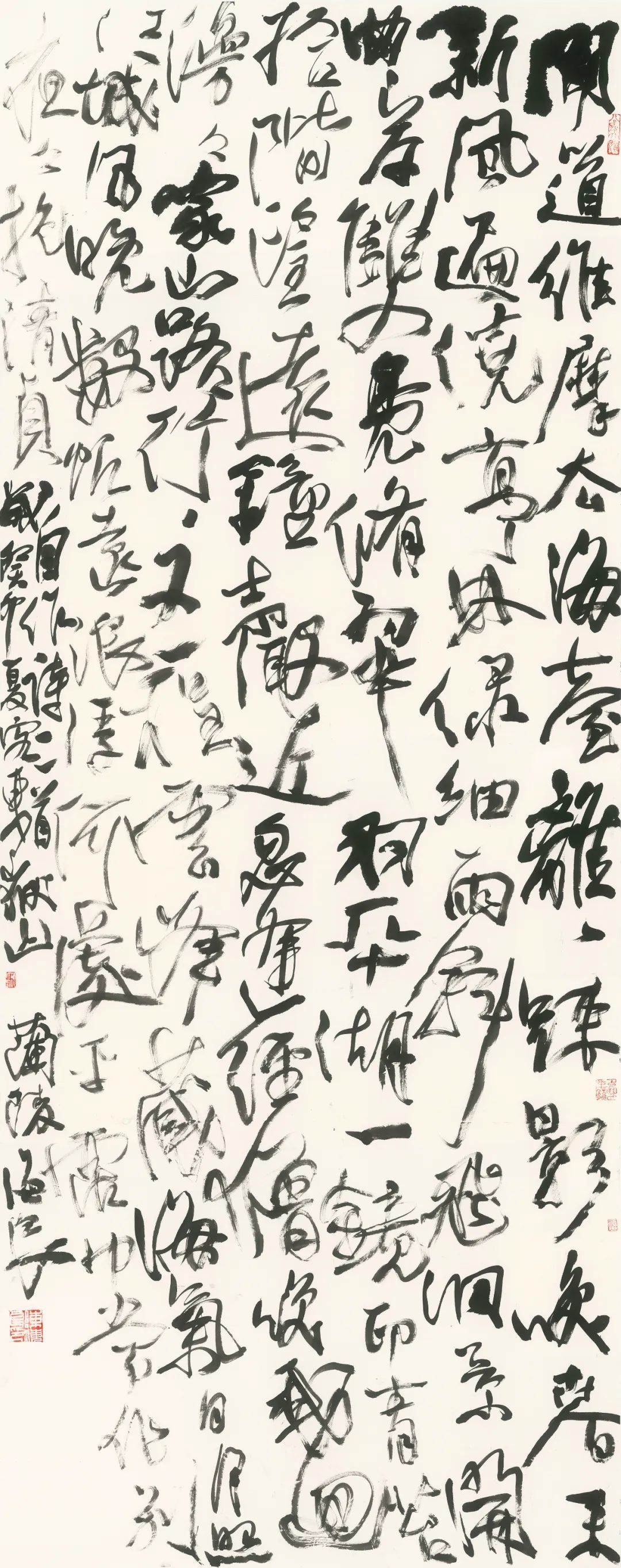 尽管如此,由于过早的涉入草书,往往为赋新诗而踌躇满志。点画厚重了则才情不足,而飘洒的才情又致使点画轻滑;强调线质却点画耐看度又不够,注重趣味了,则草情又没了。如此,不知反复了多少年……随着经验的累积,越发觉得就草而草的话,体势、技术含量、创意等皆会出现单一化趋势,同时也感受到了草书之难,越发觉得草书创作不仅仅是对书写能力的掌握,还需要对诸般有利于书写与发挥的各类资源的有效整合和融汇,方可通达“众妙神移”的风境。