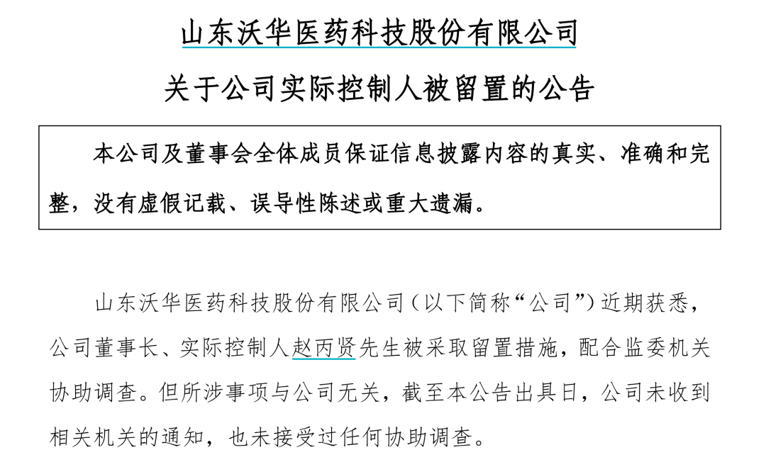 11月6日晚间,沃华医药公告称,公司董事长、实际控制人赵丙贤先生被采取留置措施,配合监委机关协助调查。但所涉事项与公司无关,截至本公告出具日,公司未收到相关机关的通知,也未接受过任何协助调查。本事项不会对公司正常生产经营产生重大影响。
