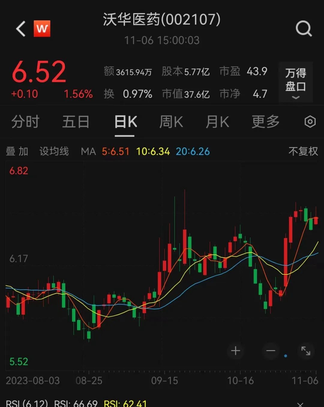 截至11月6日,沃华医药股价收于6.52元,市值37.6亿元。