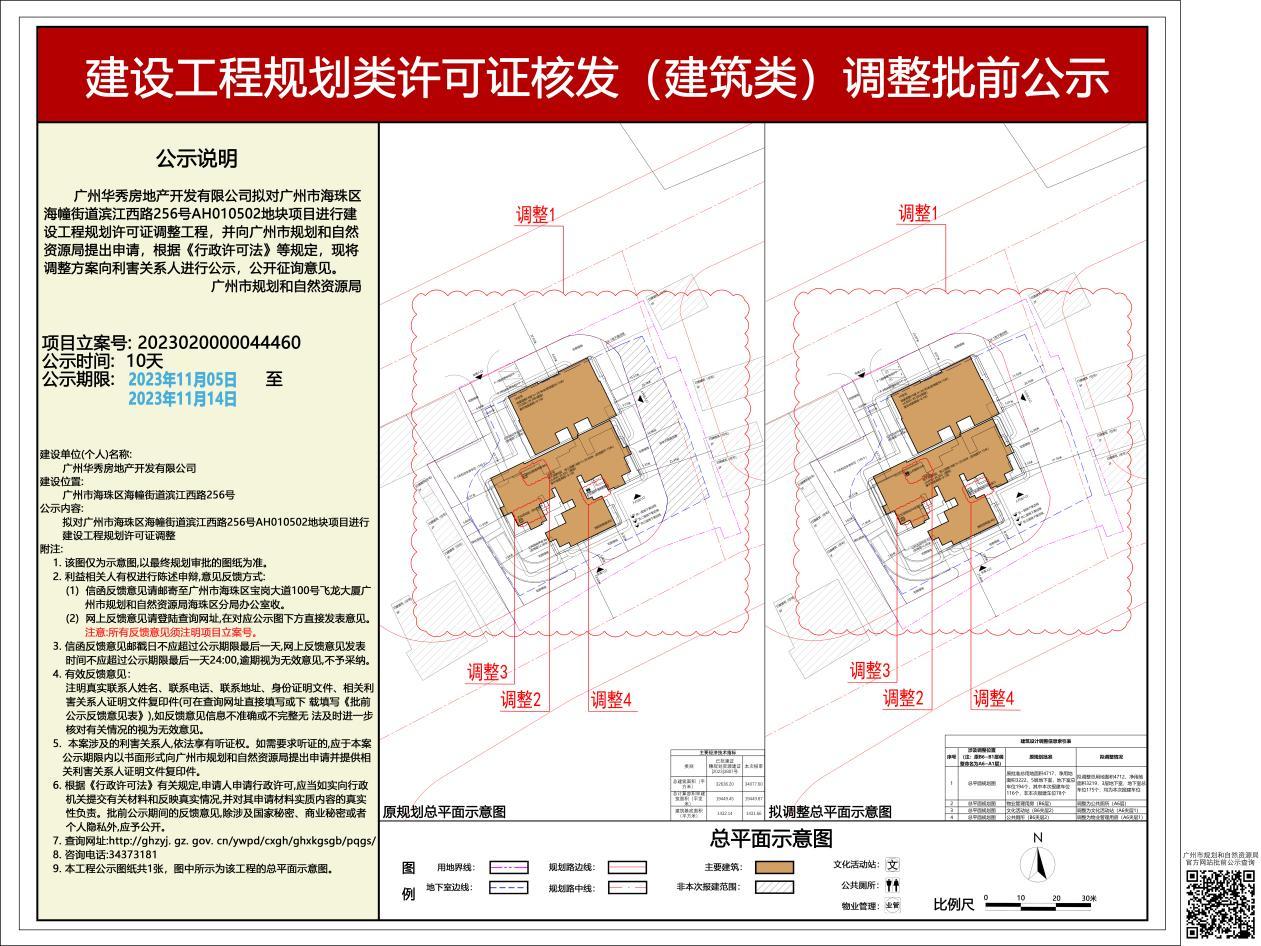 11月5日,广州市规划和自然资源局公示广州市海珠区滨江西路256号AH010502地块项目的调整批前规划。公示类别为建设工程规划类许可证核发。