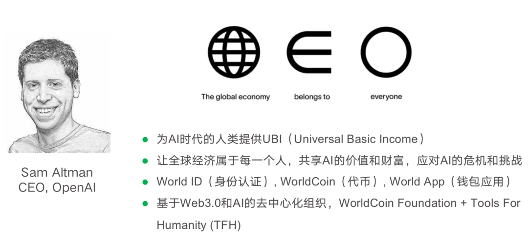 我还想到另外一个很有新意的项目,当然它也有一定争议。那就是Open AI的CEO山姆·阿尔特曼做的一个公益项目,叫World Coin,世界币,这是一个UBI的项目,就是所谓的Universal Basic Income全民基本收入,因为担心像赫拉利在《未来简史》中提到的,90%的人在未来都会被人工智能取代而失去工作,所以山姆就想做一个兜底的方案,只要你证明你是人类,他就可以给你发币。