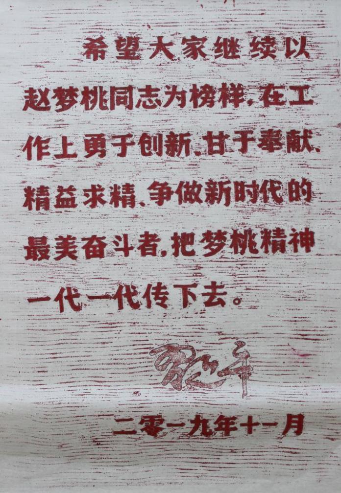 该组“弘扬传承梦桃精神”木刻版画作品,由延安市职工文化艺术工作者孙力,历时两个月精心篆刻而成。共四幅:赵梦桃同志肖像;赵梦桃纺纱工作情景;习近平总书记亲切勉励赵梦桃小组全体同志,希望大家继续以赵梦桃同志为榜样,在工作上勇于创新、甘于奉献、精益求精,争做新时代的最美奋斗者,把“梦桃精神”一代一代传下去;以及老一辈革命家习仲勋同志的亲笔题词“梦桃精神 代代相传”。