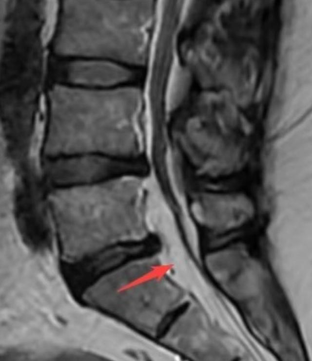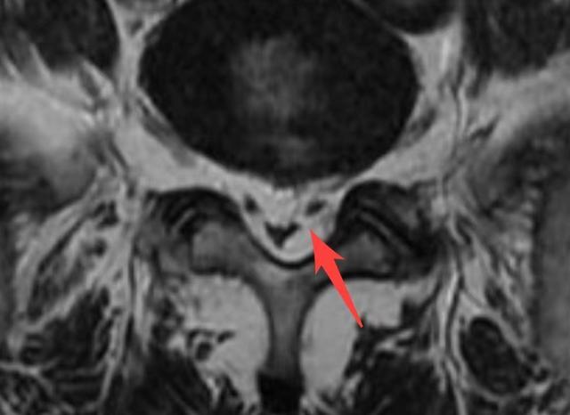 入院后的CT结果显示“椎间盘略有膨出”,这一结果难以解释他如此明显的不适症状。于是,在盛斌主任的建议下做了腰椎核磁共振,结果仍然显示:腰椎间盘轻微膨出,神经压迫不明显。为了找到导致患者症状如此严重的根源,盛斌主任反复仔细查阅影像资料后发现,其腰椎管内有异常增生的脂肪信号,初步判断为少见的“椎管内硬膜外脂肪增多症”。