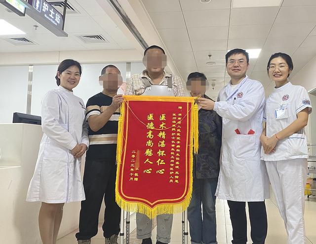 ▲患者及家属向湖南省人民医院骨科七病区团队赠送锦旗表示感谢