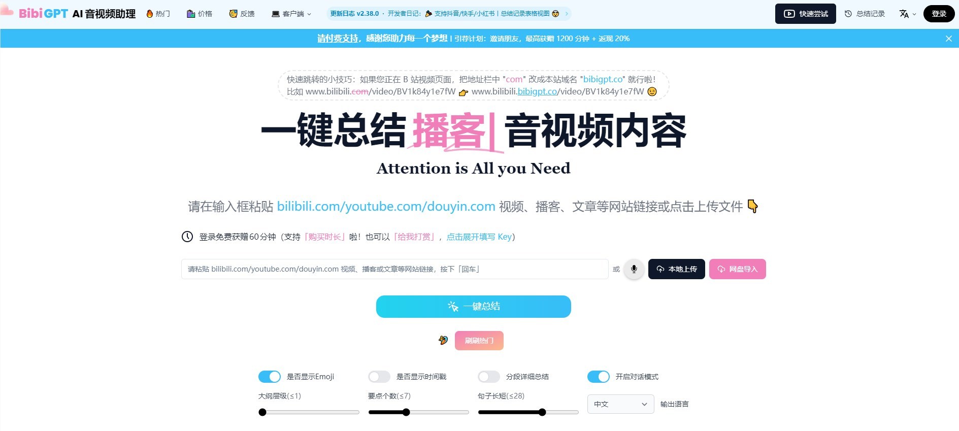 而且,BibiGPT不仅能够处理视频,还支持对音频的总结。用户可以上传本地音频文件或提供音频链接,即可获得对应音频的摘要,使得这款工具更加全面。这为音频内容的快速了解提供了一种高效的方式。