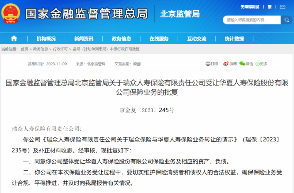 11月9日晚间,国家金融监督管理总局官网发布消息,同意瑞众人寿保险有限责任公整体受让华夏人寿保险股份有限公司保险业务及相应的资产、负债。同日晚间,瑞众人寿、华夏人寿也发布了类似公告信息。