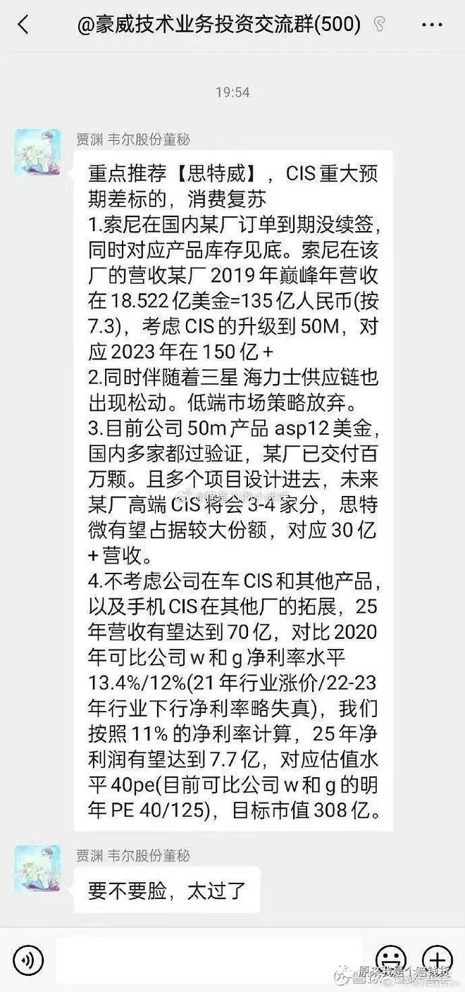 不巧的是,这篇小作文刚好被CIS龙头韦尔股份(603501)现董事兼副总经理和财务总监的贾渊揪出来,转发到群里,并付了一句“要不要脸,太过了”。