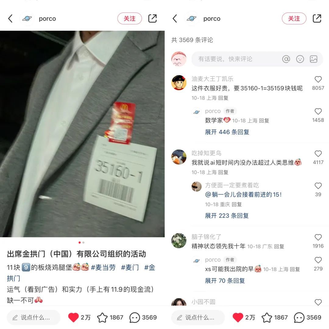 麦当劳的这场小票狂欢起源于小红书用户@proco 的一篇笔记。他晒出将麦当劳小票贴在胸前的照片,并配文“出席金拱门(中国)有限公司组织的活动”。