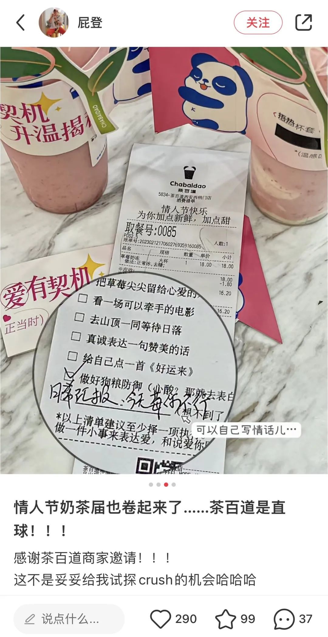 今年情人节期间,茶百道在点餐时不仅会赠送“草莓花”书签,还在情人节专属小票上印有“情人节可以做的小事儿清单”,其中包括“送给爱人/自己一束花”“看一场可以牵手的电影”……