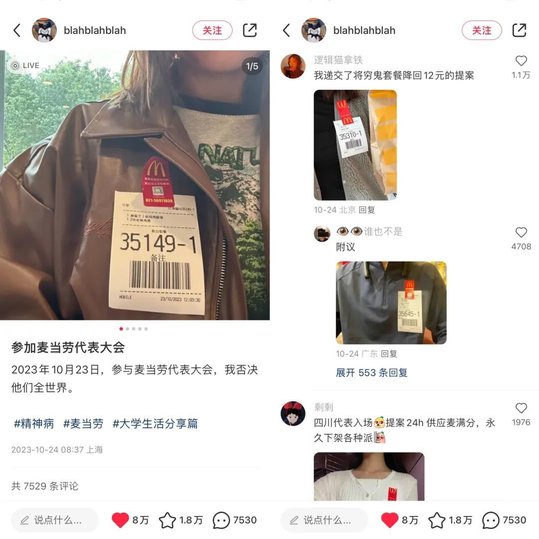 在麦当劳小票狂欢中,热度最高的笔记当属@blahblahblah 的“参加麦当劳代表大会”,并配文“2023年10月23日,参加麦当劳代表大会,我否决他们全世界”。