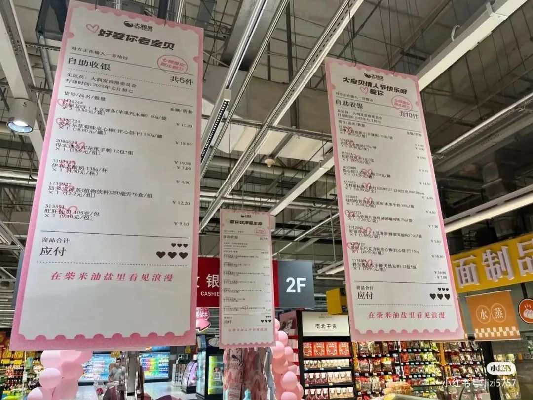 除了餐饮品牌,大润发、天猫超市等商超也曾围绕小票进行创意输出。比如大润发去年七夕在超市小票上整活,把“告白暗语”藏进商品名称,并以海报的形式悬挂在超市货架上方,手把手教大家如何利用超市小票“表白”。