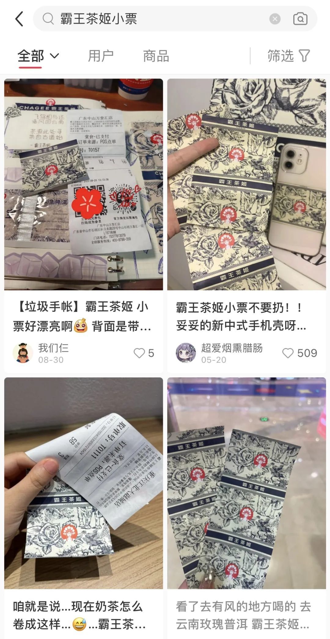 霸王茶姬则是通过小票设计吸引消费者,在网友晒出的照片可以看到,霸王茶姬小票的背面由一个个品牌印花组成,精美的图案引来不少网友进行二创,有人将其裁剪作为手机壳、书本封面等使用,甚至还有网友将小票折叠成玫瑰花,一系列的改造成果顺势成为品牌移动广告牌。