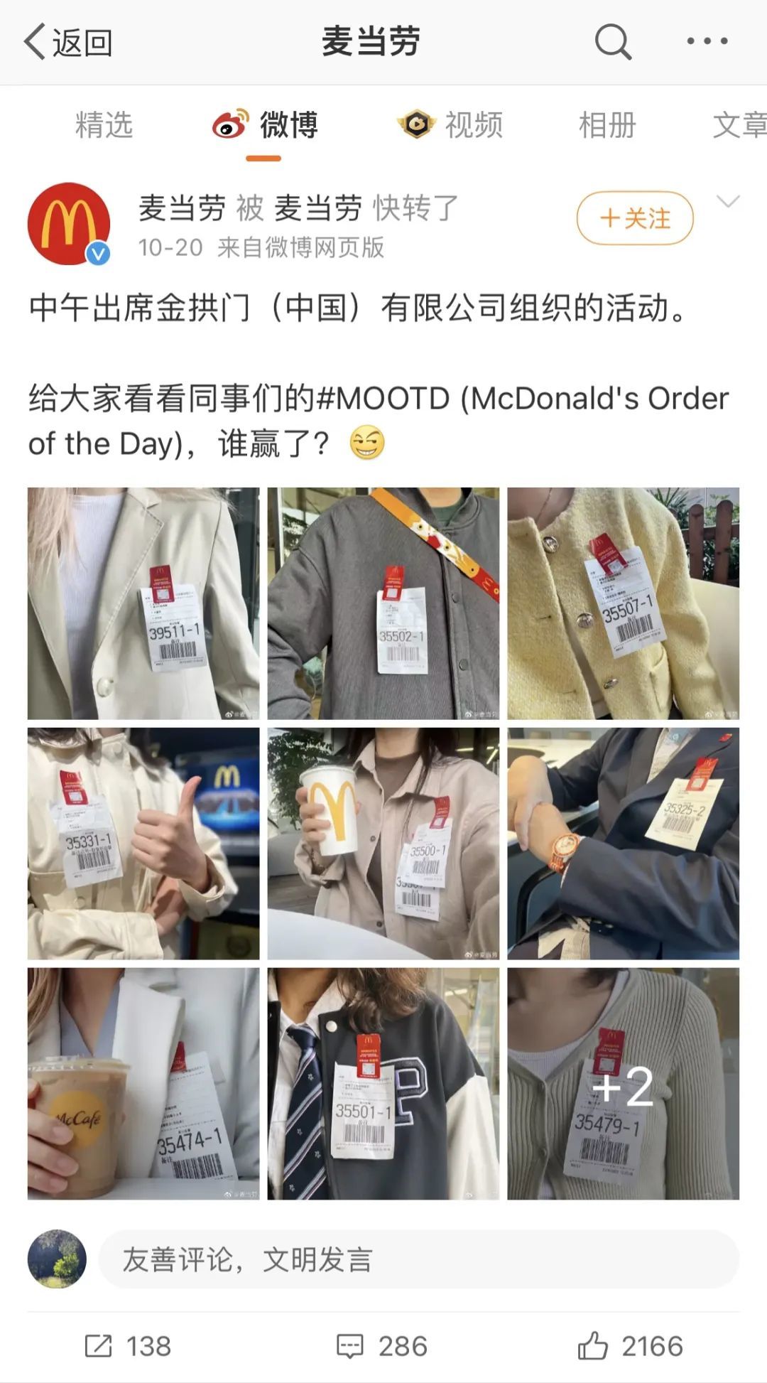 麦当劳在官微上玩起了借势营销,开启“麦门穿搭”比拼模式,并表示“评论晒出你们的#MOOTD,我揪仨请吃麦当劳”,不少网友在评论区互动。