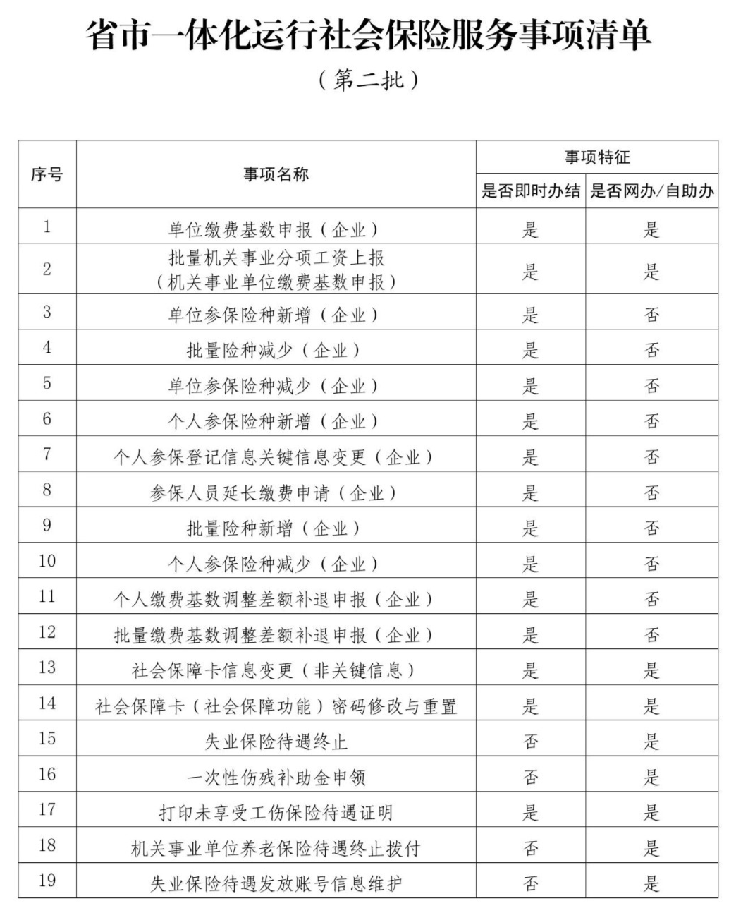 19项社会保险服务事项包括单位缴费基数申报、企业参保险种增减变动、失业保险待遇终止、一次性伤残补助金申领、打印未享受工伤保险待遇证明、失业保险待遇发放账号信息维护、社保卡信息变更等。值得注意的是,纳入省和济南市政务服务中心一体化运行的社会保险服务事项,仍可在省人力资源社会保障厅政务服务大厅办理,两处业务受理条件、办事流程、申请材料、办结时限相同。