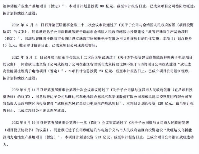 如2022年3月17日于什邡市辖区内投资建设“欣旺达什邡动力电池和储能产业生产基地项目”,计划总投资80亿元;9月14日在宜昌市辖区内投资建设“欣旺达东风宜昌动力电池生产基地项目”,本项目计划总投资120亿元;9月19日于义乌市辖区内投资建设“欣旺达义乌新能源动力电池生产基地项目”,本项目计划总投资213亿元等。