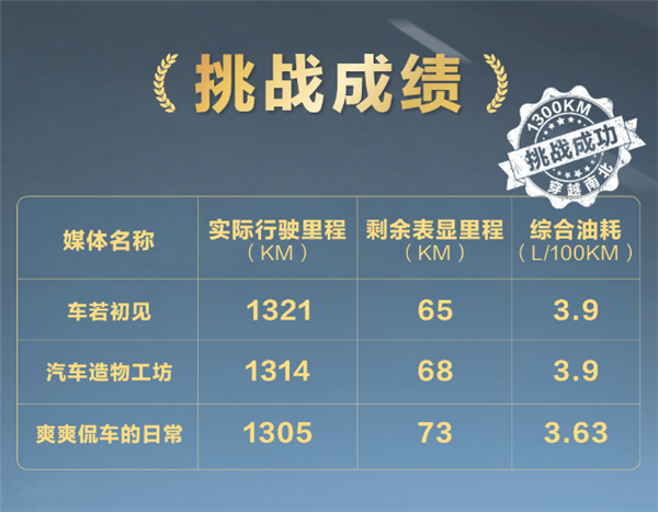 根据比亚迪官方公布的成绩单,参加的三位媒体均实现了超1300公里的实际行驶里程,综合油耗最低只有3.63L/Km。