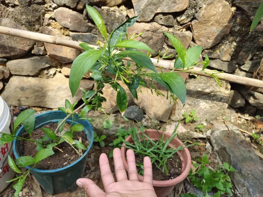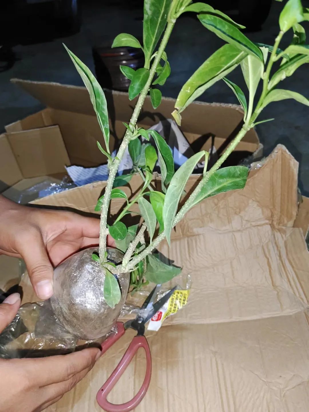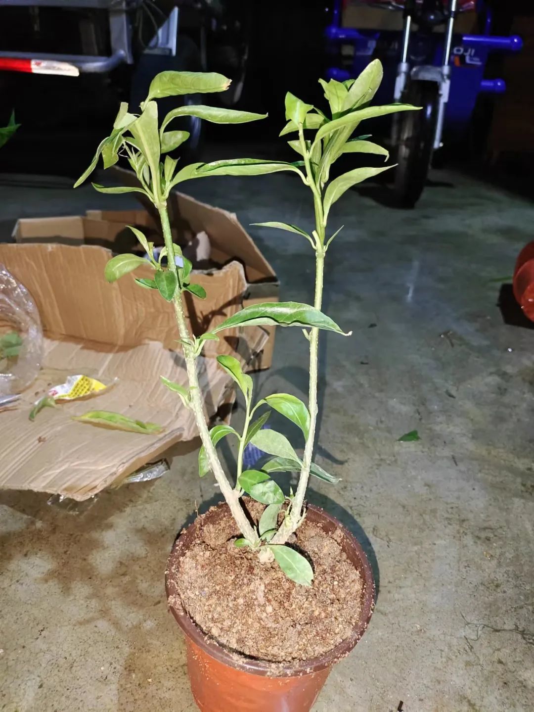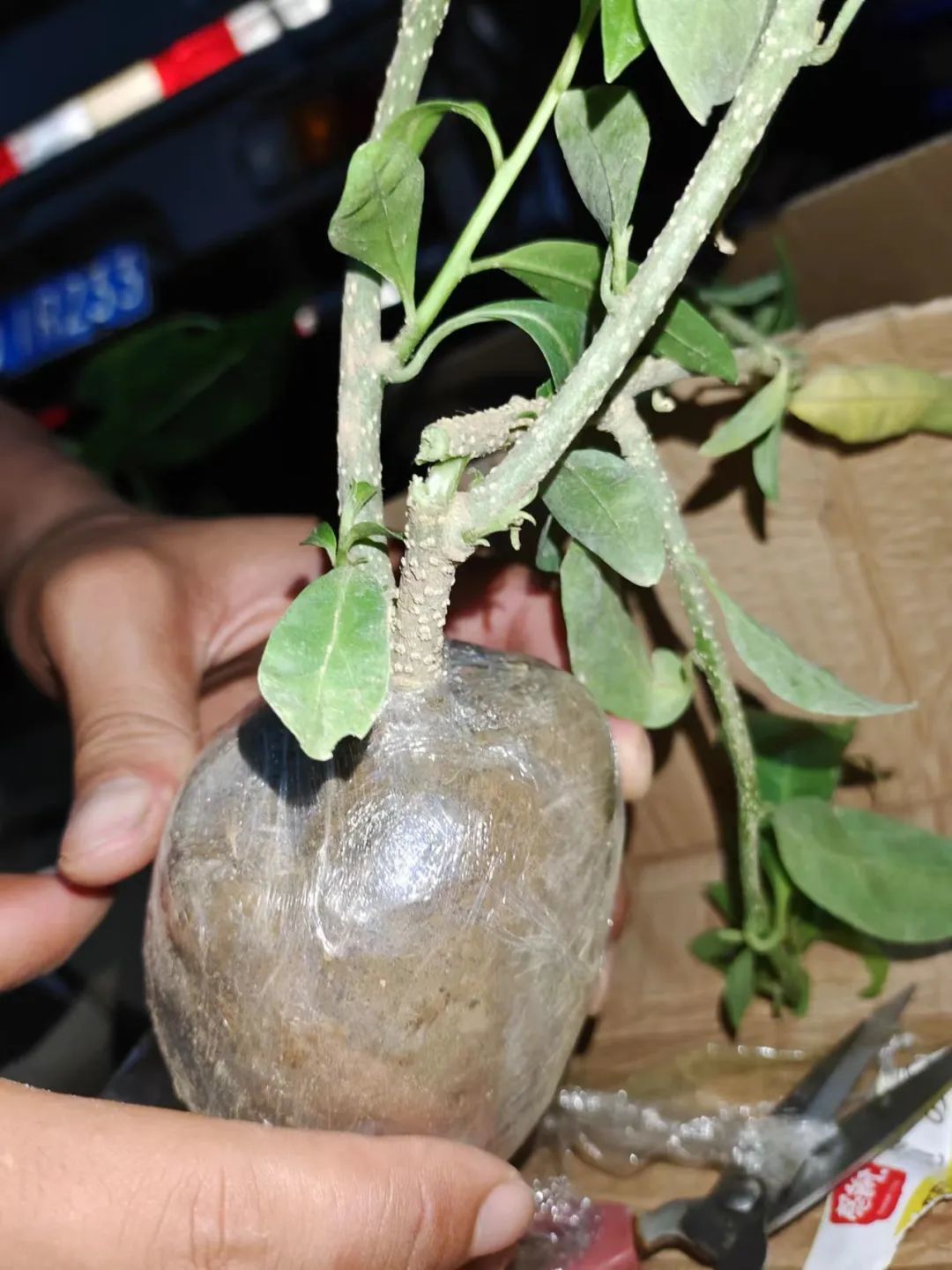 去年8月底买的夜香树裸根苗,只是一个土团包裹的,去掉包装之后,将表层土去掉,保留根系周围的土壤。