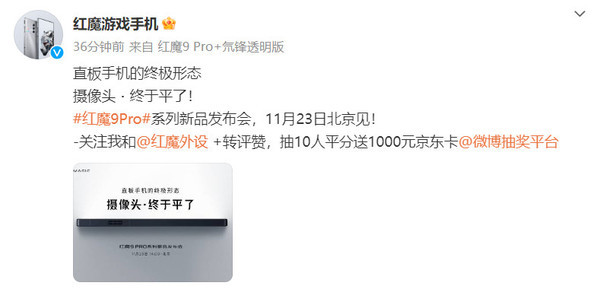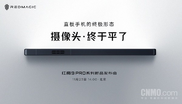 红魔9 Pro系列新品发布会定档11月23日14:00。随着发布时间的临近,官方不断放出了新机信息为发布会预热。11月14日,红魔游戏手机透露了新机的外观设计:摄像头·终于平了!