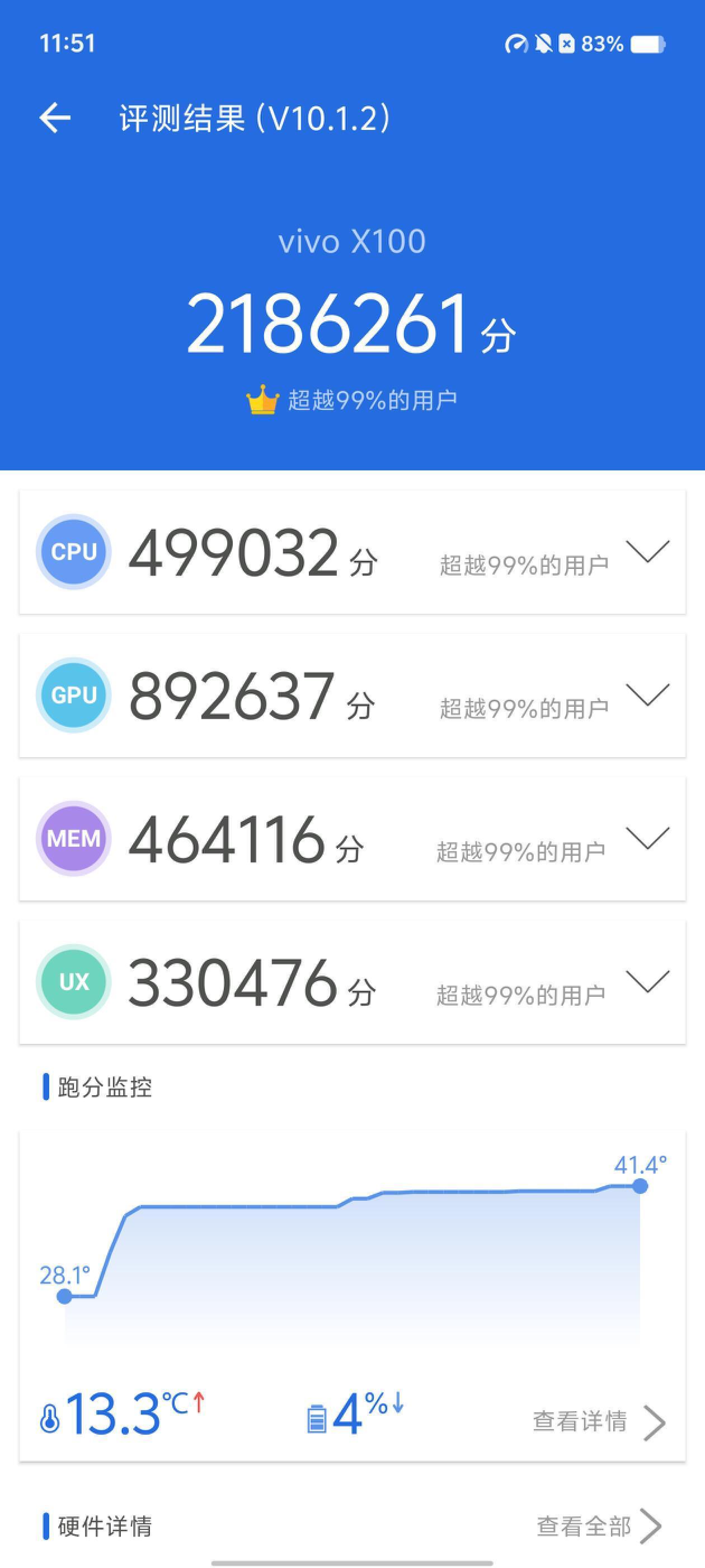这样夸张的配置,也让 vivo X100 的跑分来到了 218 万分,如果在后续更冷的天气里测试,相信分数还能有进一步上升的空间。