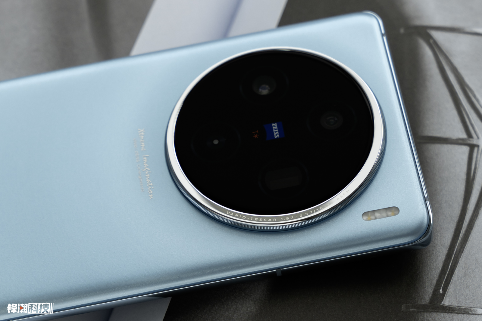 这道弦月实际上是由航空级镜面不锈钢打造的圆弧,闪烁着亮晶晶的利落金属光泽,下方是取材自手表的太阳纹理,还镌刻着对应的参数,宣告着它蔡司全焦段影像模组的身份。