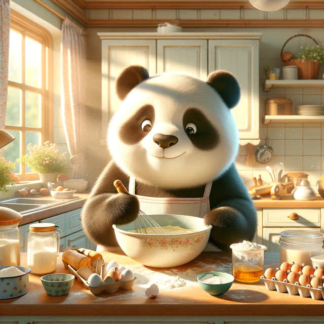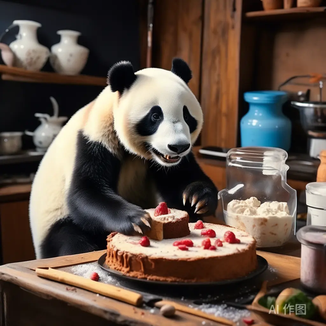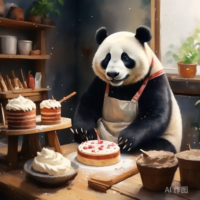 2)一个夏天的早晨,一只可爱的大熊猫在厨房烹饪蛋糕。