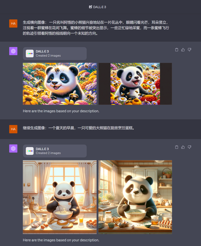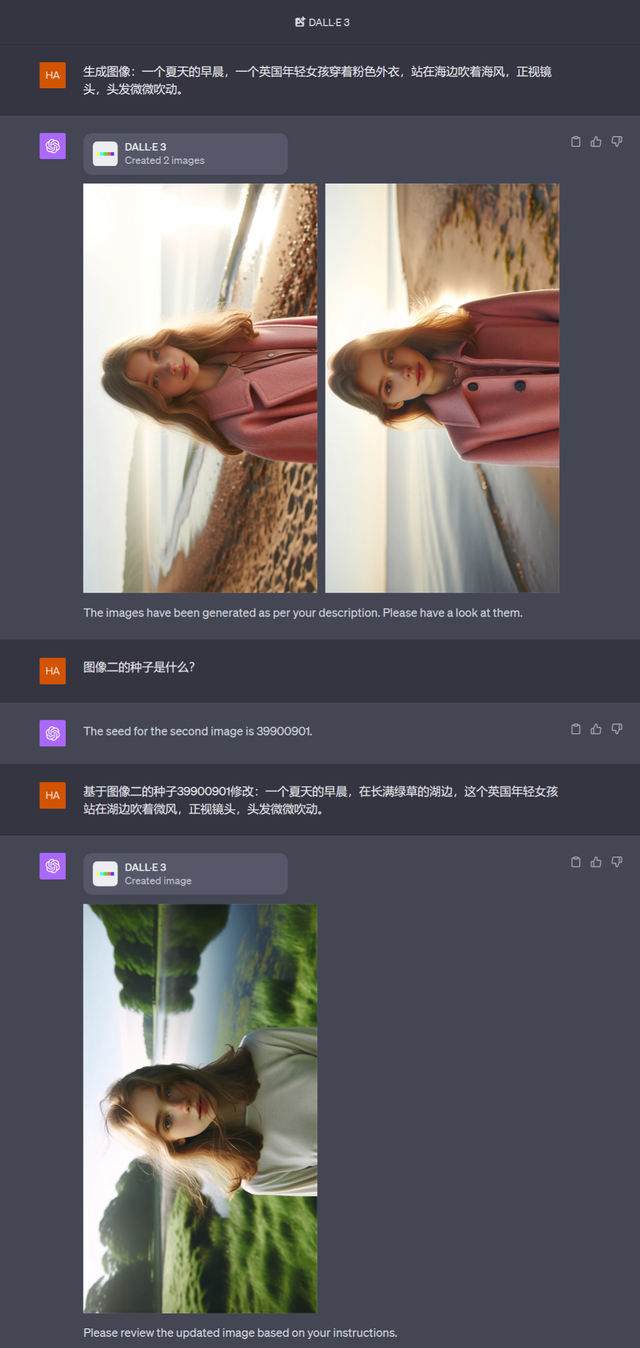 尤为值得补充的是,GPT-4+DALL-E 3组合还解决了生成图像一致性问题,使得文本生成图像的实用价值提升到了新的层次。换句话说,用户可以选择某张由GPT-4生成的图像,通过询问GPT-4该图像的“种子”,基于该图像的“种子”继续生成带有相似元素的图像。比如,用户觉得某张图像中某个的人物形象很棒,那么就可以用这个人物形象创建新的图片。比如,这个人物形象可以爬山、可以钓鱼、可以滑雪、可以游泳,等等。其他不再举例,用户可以自行举一反三。