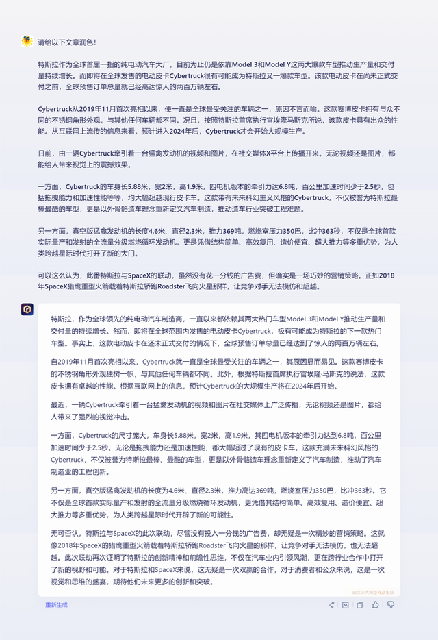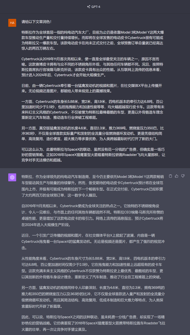 对比的结果是:文心一言4.0帮助润色后的文章,读起来给人的感觉比较生硬。然而,经过GPT-4润色后,该文章整体给人阅读后的效果确实更好了,几乎看不出是AI机器人写的——GPT-4在用词造句、谋篇布局等方面更有讲究、更有技巧。